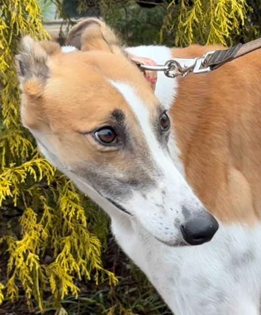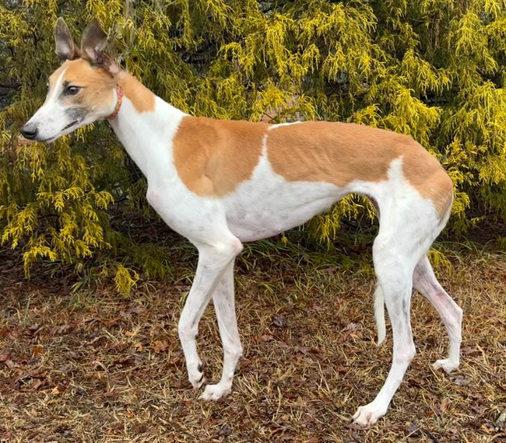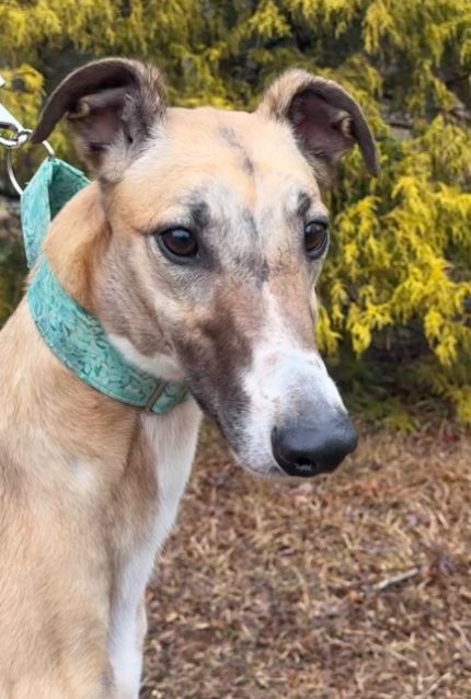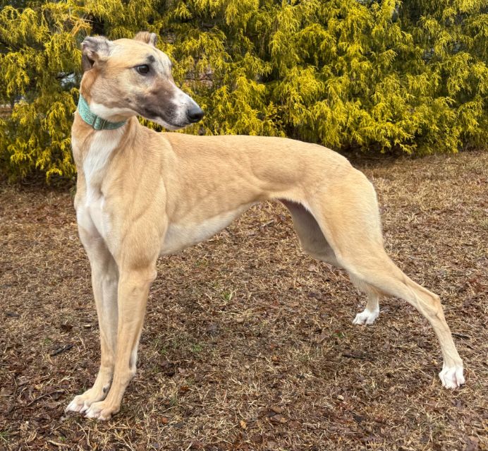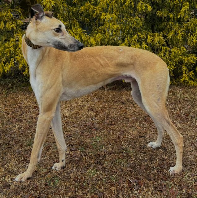 Candy just arrived from the Tri-State Race Track in WV where she raced 4 races. She raced the rest of her 22 races at the Wheeling WV race track. She only won 2 races and raced at the lower C and D levels. Her last race was August 22nd of 2024 and she has been back with her owner on the farm since then. Her sire is the famous DJays Octane and her dam is PJ Kool Aid. Candy will turn 4 on July 6th. She is a smaller girl racing at 60lbs. Candy is a timid girl, that has been very overwhelmed by everything new. She seems to want affection, but can be a bit cautious at first with people she doesn't know and approaches carefully. She likes her routine and learned which kennel was hers the first night. She is very quiet in her kennel. She seems to do best with other dogs around and is less nervous and braver with other dogs around. She showed no interest in chasing the cat or small dog she met so could live with either. Although she approached kids and seemed to be cautiously friendly with them, since she is shy, Candy would probably do best in a quiet home with quiet kids or no children. Candy is a sweet little girl that will need some time to adapt and build confidence with her new family. She is good with other dogs and seems to try to avoid any conflict. |