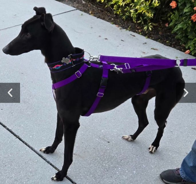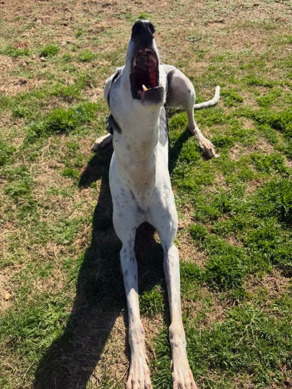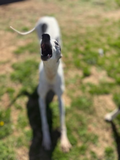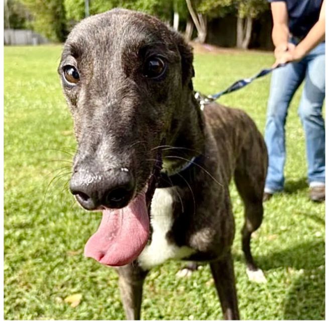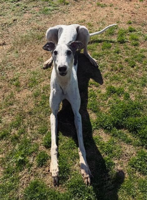 Toast just arrived from Tri State Race Track in WV, where he raced 83 races. He was a good racer getting up to the top AA level, winning 11 races and placing in a lot more. Toast is a mid sized male, racing at 73lbs. His DOB is 8/31/22, so he won't turn 4 until the end of July. Toast's sire is the famous Highly Classified and his dam is ABS Almighty. He was very interested in the cat at first, but after a slap from the cat, didn't even want to get near it or look at it again. We think he may be trainable and should be able to live with a confident cat, that would put him in his place. Toast was good with the small dog he met. He is an extremely confident guy, that loves people and wanted to help drive on the trip to SC. He can be pushy about getting what he wants. He was bossy with the other dogs on the trip down, and seems like a natural leader of the pack. Other than being a bit bossy,Toast has done fine with the other dogs in his foster home and seems to need another dog around. He did stress when being left completely alone. Toast liked the kids he met, but he does like to give hugs, so could easily knock over a small child. We think he needs a home with no small kids. He is doing great in his foster home and doesn't seem to be stressed, except when left alone. He reacts with curiosity to everything and is fearful of nothing so far. Toast is a lot of happy dog that is going to be the life of the party. His favorite thing other than love is playing with toys. |
