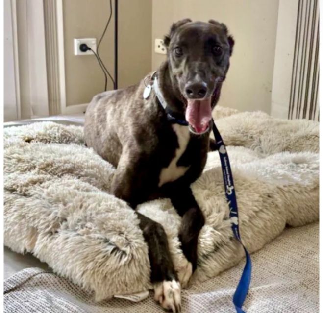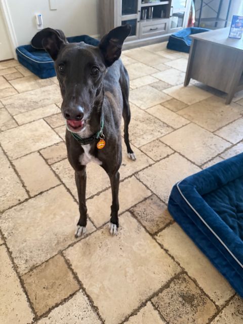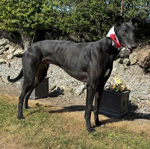 Disco Pants (Billy) is ready to boogie his way right into your heart! He is arriving soon from Ireland where he raced 63 races at Tralee, Shelbourne Park, Limerick, Cork, Mullingar, and Clonmel. He was a good racer winning 18 of his races and placing in many of the others. His last race was July 6th of 2024 and he has been waiting on a home since then. Billy raced at 76lbs and his DOB is March 15 2020. His sire is the famous Kinloch Brae and his dam is Bling Bling Lola. This very affectionate boy absolutely loves being close to his people. Whether it’s leaning in for pets, following you from room to room, or settling in for a cozy nap nearby, Billy is happiest when he’s sharing his space — and his big loving heart — with you.Billy walks nicely on lead and enjoys getting out and about. However, if a rabbit or squirrel makes an appearance, his inner athlete wakes up! A handler who can gently redirect him and keep a steady hold will do just fine. He gets too excited about cats to be able to live with them. Billy does well with quiet, well-behaved dogs and would thrive in a calm home where he can relax, feel secure, and soak up plenty of affection. If you’re looking for a sweet, loving companion with just the right amount of sparkle, Disco Pants (Billy) is ready to dance into your life! |