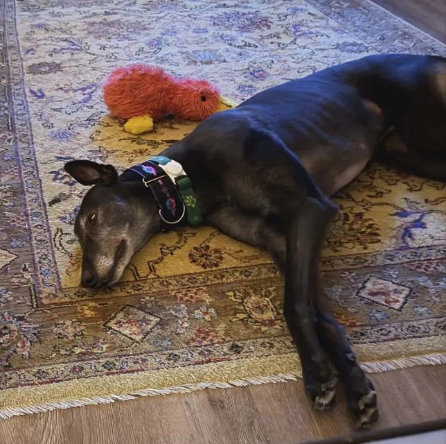 Ding Dong is a sweet boy with a very silly name. He was born in Ireland but raced in UK at Oxford Race Course. Ding Dong was a very good racer running at A level and winning 12 of his 52 races. He almost always placed in the top 4 in every other race. He weighs 70lbs, so is a mid-sized male. His sire is Cabra Firmino and his dam is Black Buzey. He was born September 1st of 2022. He did not pass his cat or small dog tests so needs a home without them, everything small looks like a squirrel to Ding Dong. He is in a temporary foster home now in Florida and is doing really well there. They say that he is getting better with smaller animals the longer he is exposed to them. They report that Ding Dong loves meeting new people and loves walks, toys and petting. He walks well on lead and eats well. Ding Dong would be fine as an only dog, but he wouldn't mind a home with a female dog - he likes the ladies. His foster home has reported no food aggression or sleep startle. |