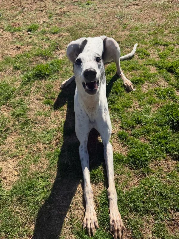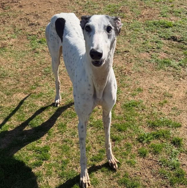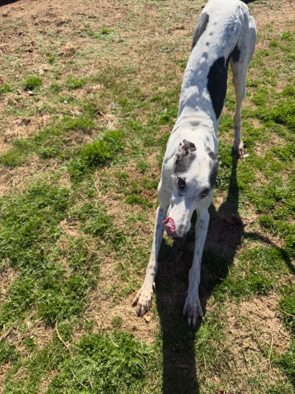 Mystery is a sweet, white girl with black spots that was initially adopted through another group that has now gone out of business. She has been in an adoptive home for years, so is already home acclimated. Mystery never raced but does have tattoos. She is a friendly girl that does the big greyhound grin that is a submissive, happy gesture. So cute! Although she initially tested safe with small dogs, over time she has shown both foster families in AL that her personality changes as she becomes comfortable. She's an alpha girl who will begin to guard her space with other dogs in her home and has confidence to test the limits with them. Because of this history, we feel she would not only be best but probably the most happy long-term as an only dog in her home. She could be the perfect match for a family with greyhound experience hoping to have only one slightly older dog. Mystery weighs around 63lbs and will be vetted as soon as she arrives. She likes to play in very short spurts, but is mostly calm and enjoys her naps. She is not a fan of crates and tends to panic if put in one. She does complain a bit when babygated, so she's probably not a good choice in apartments, if gating will be required. Her foster mom describes her as a extremely affectionate with her humans, choosing to spend time with them and following activities around the home. She's a snuggler on a bed or the couch too. She is great on leash and walks quietly by your side so would be great for families who leash walk daily. What a great girl just looking for the perfect home! |