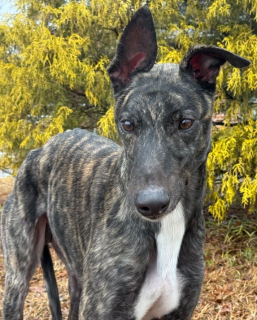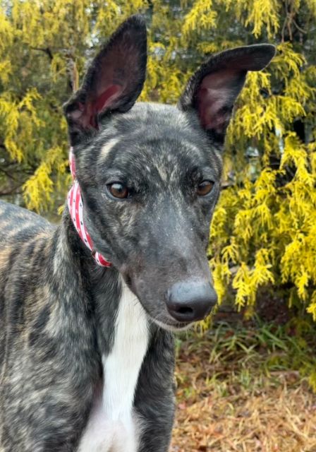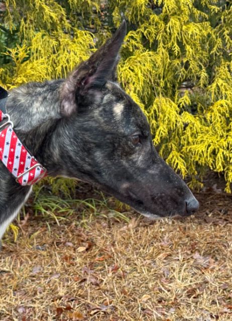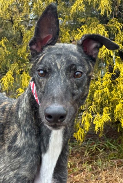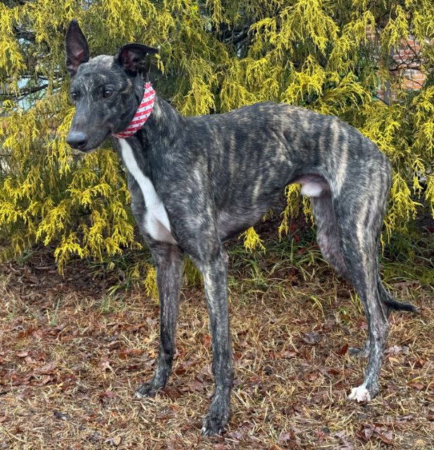 Toast just arrived from Tri State Race Track in WV, where he raced 83 races. He was a good racer getting up to the top AA level, winning 11 races and placing in a lot more. Toast is a mid sized male, racing at 73lbs. His DOB is 8/31/22, so he won't turn 4 until the end of July. Toast's sire is the famous Highly Classified and his dam is ABS Almighty. He was very interested in the cat at first, but after a slap from the cat, didn't even want to get near it or look at it again. We think he may be trainable and should be able to live with a confident cat, that would put him in his place. Toast was good with the small dog he met. He is an extremely confident guy, that loves people and wanted to help drive on the trip to SC. He can be pushy about getting what he wants. He was bossy with the other dogs on the trip down and seems like a natural leader of the pack. He liked the kids he met, but he does like to give hugs, so could easily knock over a small child. He is doing great in his foster home and doesn't seem to be stressed. He reacts with curiosity to everything and is fearful of nothing so far. Toast is a lot of happy dog. |