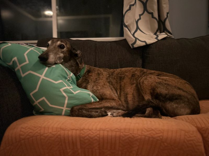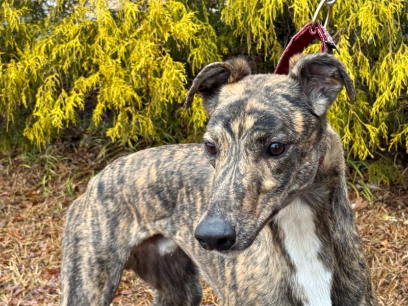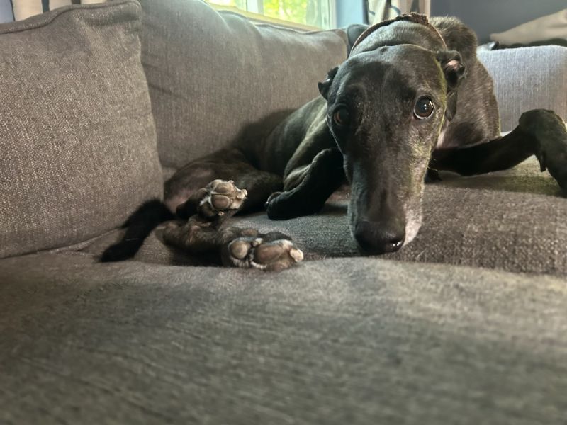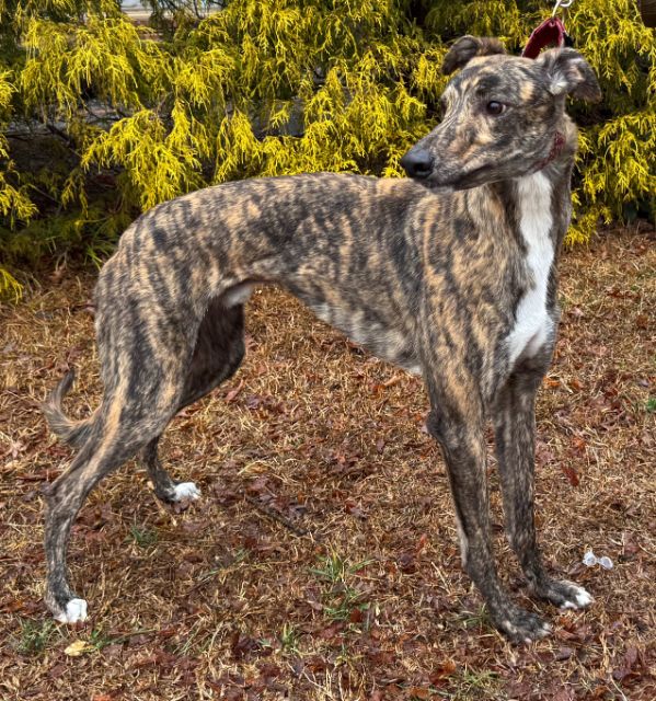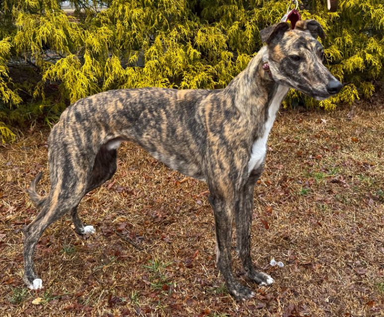 Hlos Intimidator is definitely not intimidating, and was actually called Jim at the farm. Jim never raced and came to us straight from the farm he was raised on in WV. He just wasn't interested enough in racing to ever make it to the race track. His Sire is RCK Goneinaflash and his dam is RCK Golden Grace. His sister Shear Volume arrived with him. Jim's date of birth is 4/12/24 so he will turn 2 in April. He is a very young guy that still has a bit of a puppy look to him. He never got an official racing weight but is around 75lbs. He is a very tall, narrow boy that is taller than most at that weight. His back touched the top of our large kennel. Jim is a sweet boy that seems to love people. He was a little overwhelmed by his first trip away from home, but seemed to handle everything remarkably well. He liked the kids he met. He was interested at first in the cat, but seemed mostly curious and appeared very trainable with some supervision at first. He was good with the small white dog he met so should be fine to live with small dogs too. Jim seems curious about his surroundings so we think he is likely to gain confidence fast. He seemed pretty calm for a pup and got along well with the other greyhounds. He hasn't been pushy or demanding but does love attention. |