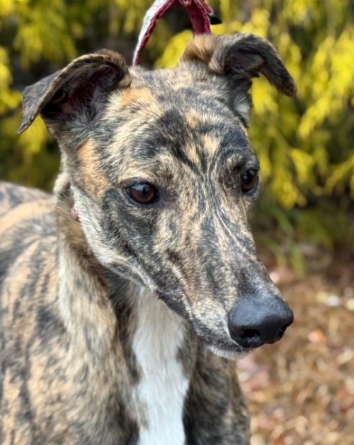 Candy just arrived from the Tri-State Race Track in WV where she raced 4 races. She raced the rest of her 22 races at the Wheeling WV race track. She only won 2 races and raced at the lower C and D levels. Her last race was August 22nd of 2024 and she has been back with her owner on the farm since then. Her sire is the famous DJays Octane and her dam is PJ Kool Aid. Candy will turn 4 on July 6th. She is a smaller girl racing at 60lbs. Candy is a timid girl, that has been very overwhelmed by everything new. She seems to want affection, but can be very cautious at first with people she doesn't know and approaches carefully or stays at a distance. She likes her routine and learned which kennel was hers the first night. She is very quiet in her kennel and considers it her safe place. She chooses to stay in her kennel even with the door open. She seems to do best with other dogs around and is less nervous and braver with other dogs to follow. She showed no interest in chasing the cat or small dog she met, so could live with either. She approached kids and seemed to be cautiously friendly with them. Because she is shy, Candy would probably do best in a quiet home with quiet kids or no children. Candy is a sweet little girl that will need time and patience to adapt and build confidence with her new family. Dogs that are shy can take months to warm up. She is good with other dogs and seems to try to avoid any conflict. |